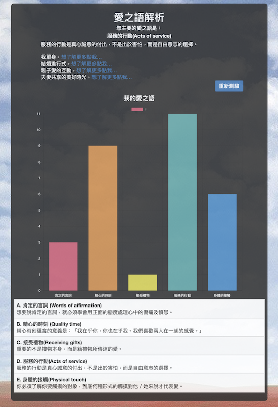 我的愛之語是服務的行動及精心的時刻,但身體的接觸跟肯定的言詞還是會很開心。週遭的人也很少是接受禮物,禮物比較像是一個社交禮儀,例如去拜訪人家家裡需要帶伴手禮,以及聖誕節為家人準備禮物、或是生日禮物等。