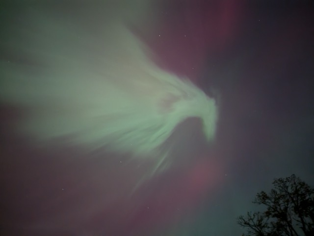 極光移動到頭上一下像紅色翅膀的浴火鳳凰,一下像夜光玉鳥,又變成馬的形象,媽媽覺得有趣極了!